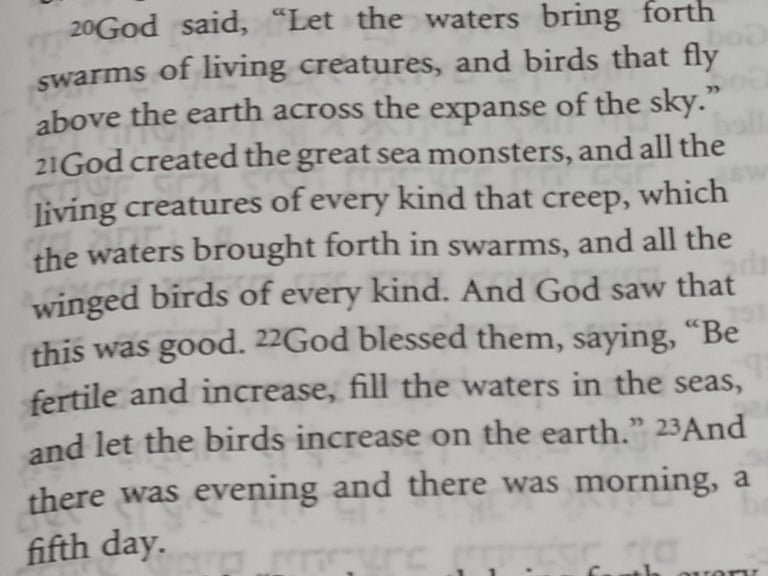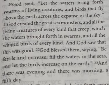 On the fifth day of creation, it sounds like God was really busy! He created all the sea creatures and all the creatures that fly through the air! Just think about it! There are so many kinds of fish... big ones like the sharks all the way down to tiny little minnows. Then there are other sea creatures: whales, shrimp, jellyfish, etc. The list would get really long if we tried to list them all! He also made everything that flies through the air. There are many, many kinds of birds, but also large swarms of insects. It's nearly impossible for me to think of all the creatures that came into being on this day! God saw that all this was good! He blessed the creatures and told them to have babies and fill the earth. Here is a challenge for you. Look through your own picture sources, photo alums, magazines, etc. and see how many creatures you can find to fit in the "created on the fifth day" category. You can also look through the lessons and pictures on this website. You will spot many pictures that will show things that God created that would fit in more than one category. For instance, a picture of cows in the pasture would fit in both third day and sixth day. (We will study the sixth day next.) Have fun!