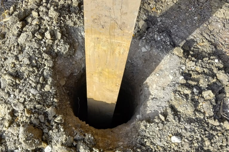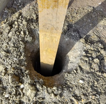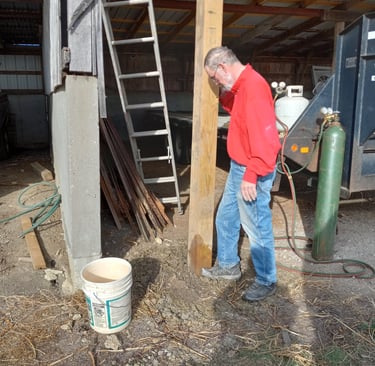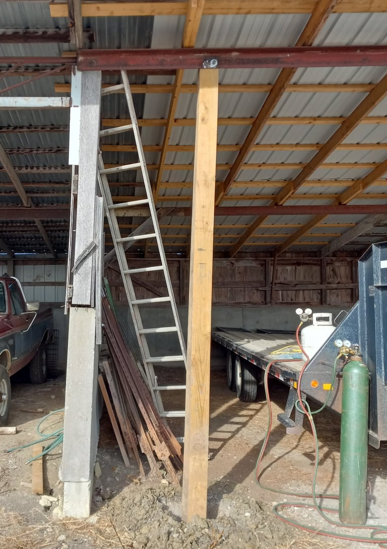 He dug a deep hole, set a strong post into it and fastened the post to the iron beam that holds the roof. He poured concrete into the hole to hold the bottom of the post firmly, and then packed the dirt tightly around it to make the ground level again.