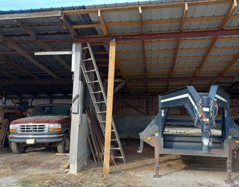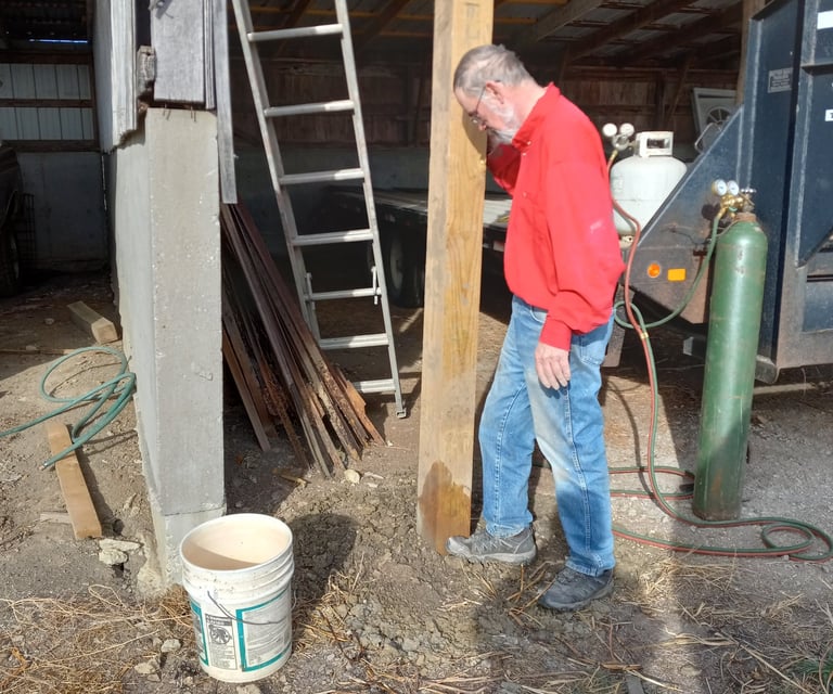 The strong wind that caused that other damage tried to take off the roof of this section, too. It was pushing up on the roof and lifting this section of the wall right off of the concrete base. Can you see the nails sticking down at the bottom of the square post? That post had been nailed firmly to a board that is no longer even there. That baseboard had become rather rotten over time, and was splintered and blown away by the storm. This caused the post to be sitting on nothing but the nails. Grandpa bolted on the board, that you see on the right side, as a temporary anchor to hold the post down against the concrete part of the wall. You can tell that the post was actually shifted forward a bit, because a couple of the nails are just hanging down in front of the concrete. A couple weeks ago, Grandpa finally was able to put in a more permanent support for the roof.